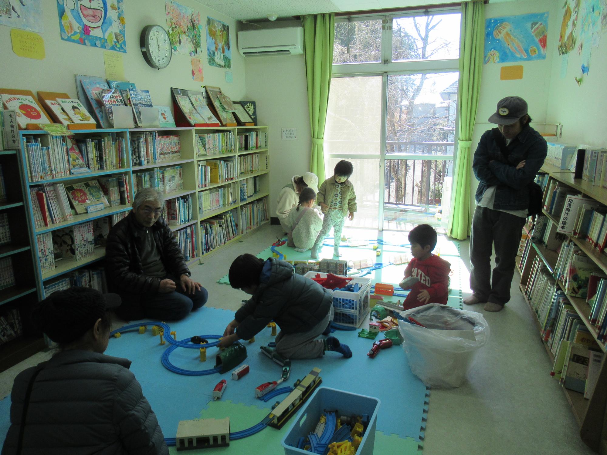 図書室ではプラレール広場を設置しました♪